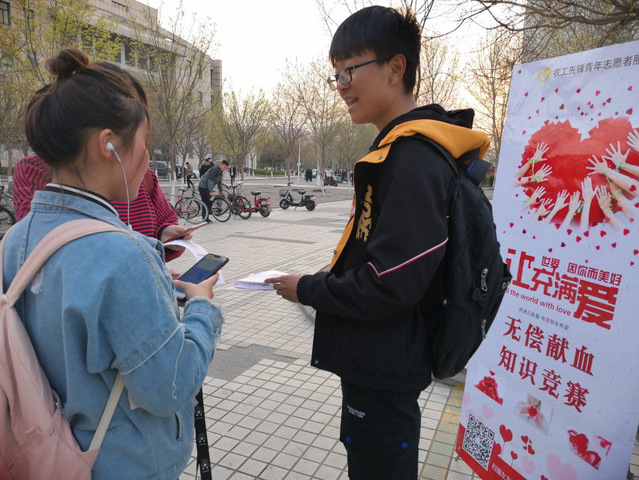 今年是献血法实施 20周年,为了更好地加强高校老员工对无偿献血的认识以及对无偿献血知识的了解,让更多的老员工加入无偿献血的队伍。农工先锋青年志愿者服务团成员于4月1日至4月4日在公司各个餐厅门口开展了以无偿献血做善事,救死扶伤显爱心”为主题的献血知识竞赛宣传活动。此次宣传活动由志愿团团长刘瑶主持,农工先锋志愿团成员参加。