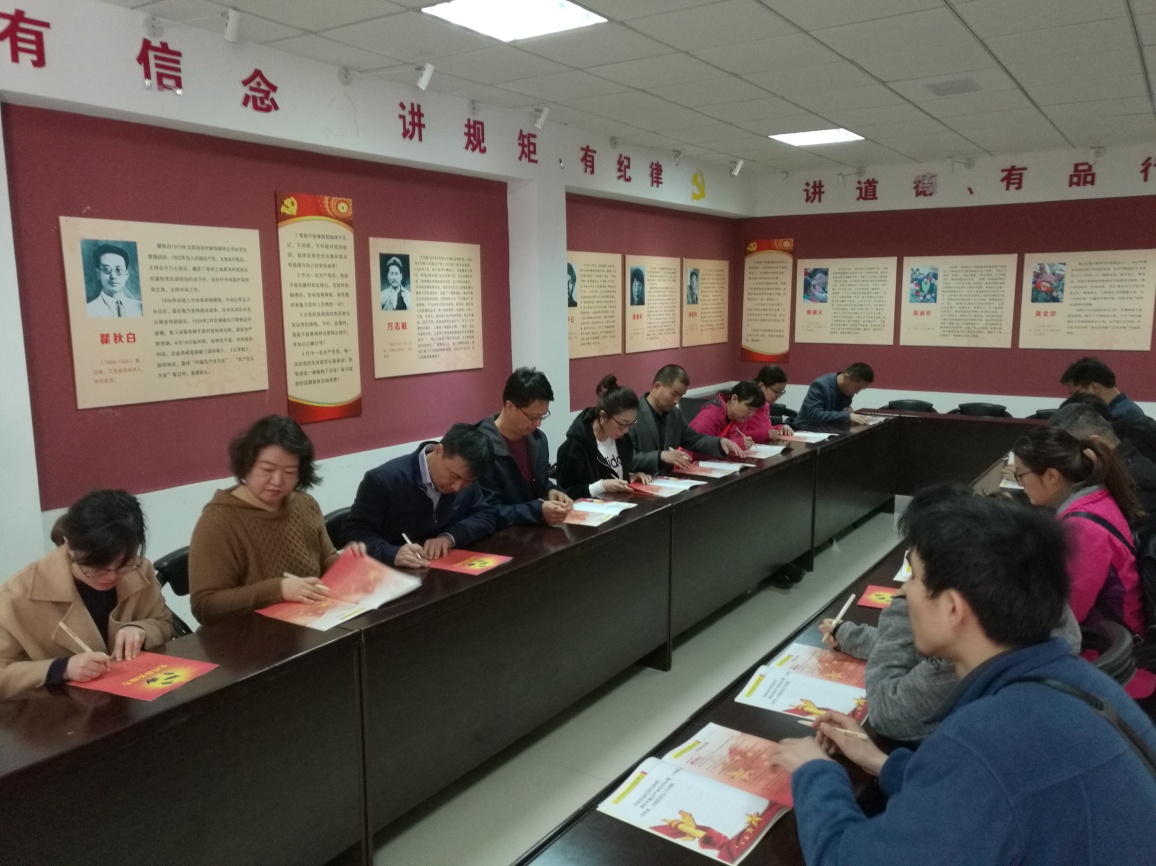 为更好的贯彻习近平总书记提出“要突出问题导向,学要带着问题学,做要针对问题改”的要求,公司教工党员代表又参观了党性体检馆。体检馆分学习区、党性自检室、初心唤醒室、党性会诊室四个功能区。在参观学习区学党章,学习习近平总书记系列讲话;在初心唤醒室通过观看《党性教育宣传片—奋斗》认真思考入党动机;在党性自检室进行党性自检;在公司党总支书记柳铎的带领下重温入党誓词。同志们纷纷表示,通过党性体检,强化了自身的党性观念和宗旨意识,有了明确的学习目标和整改目标。