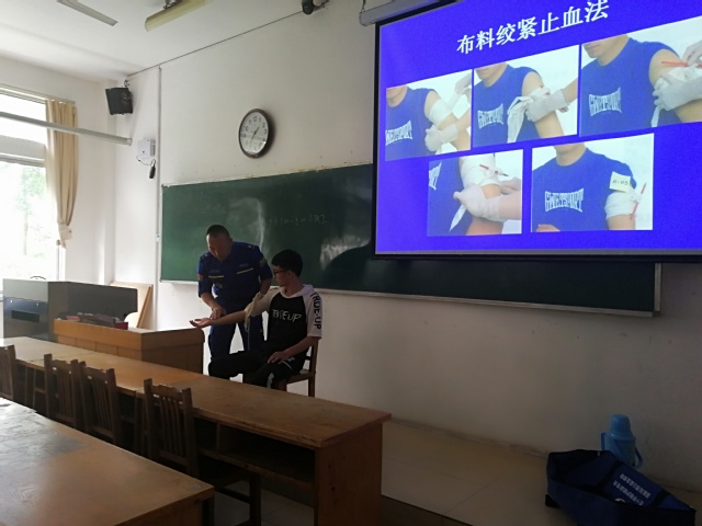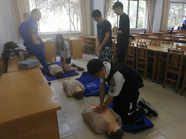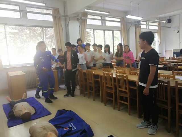 活动伊始,四位老师先做自我介绍,然后开始轮流讲解急救知识。首先,由郑俊哲为大家讲解了中国红十字会精神:人道,博爱,奉献。然后,郑俊哲通过模型教给同学们心肺复苏和人工呼吸的技巧,台下的同学们都聚精会神的聆听并笔耕不辍的记笔记。接下来,由李华为同学们详细讲解了止血、固定、包扎、搬运四个急救手法的具体操作,其中,重点讲述了止血和固定的方法和注意事项,并用真实的实例帮助同学们了解学习必备的医疗急救手法的重要性,每位同学都在认真的学习,并且上台演示。老师们也详细解答同学们的疑问。最后,开展急救知识考核,主要检查同学们对包扎和人工呼吸的掌握情况与实际应用能力,并对比赛中通过考核的同学颁发急救证书。考核结束后,全部人员在12号教学楼前拍照留念。