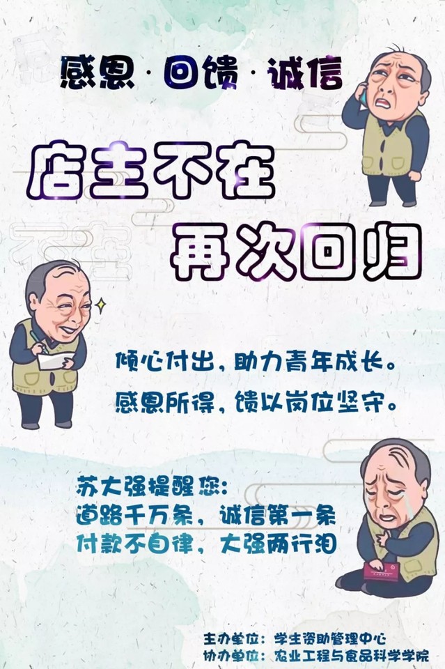 “店主不在”活动在12号教学楼大厅设立无人售货点,活动时间为20195月下旬至20197月,主要供应文具百货、饮料以及消暑小杂物,供应时间为上午750至晚上2130,支持支付宝、微信及现金支付。