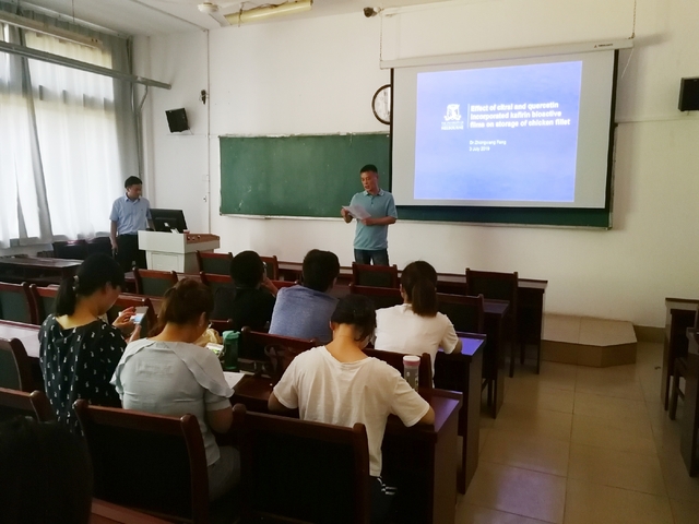 在接下来的学术报告中方教授着重介绍了食品智能/活性包装领域的研究进展,深入浅出地介绍了高粱醇溶蛋白生物活性膜的制备与表征,及其在生鲜食品尤其是肉制品保鲜中的应用,为参会师生提供了本领域前沿进展,拓宽了学术视野。方教授和广大师生们开展了深入交流,参会师生受益匪浅。