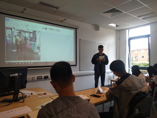 上午是英语课,Martin老师非常的热情,幽默,专业。前两节课内老师先自己做自我介绍,自我介绍的方式 非常的独特,有趣,给我们留下了很深的印象。之后老师要求大家按照他自我介绍的方式每个人站在讲台上进行自我介绍。整个过程非常的愉快顺利,同学们与老师的关系很快就拉近了。