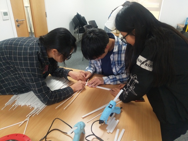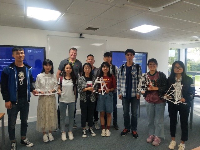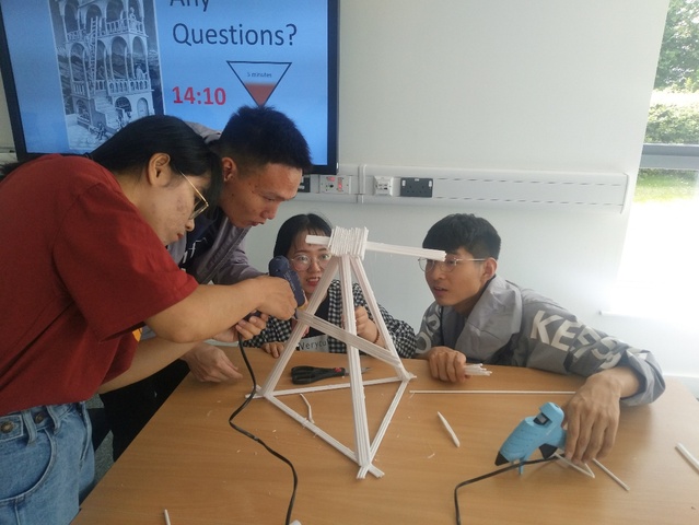 下午两点访学团师生来到AEIC学习g classes。Chris Waghorn老师讲述了设计的概念及世界各地著名的塔,随后给我们布置了任务,即用热熔胶和纸棒搭一个高度300mm,可以承重1Kg的塔。