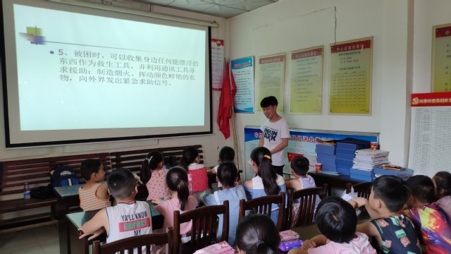 为了提高员工们面对紧急情况时的自救能力,“心系三农,寻古尚寨”实践团支教组决定开设自救知识这一课程。洪水自救知识的授课老师是实践团成员辛绍雷,他主要教授孩子们发生洪水时的自救措施,还带着员工们认识洪水、了解诱发洪水的因素。