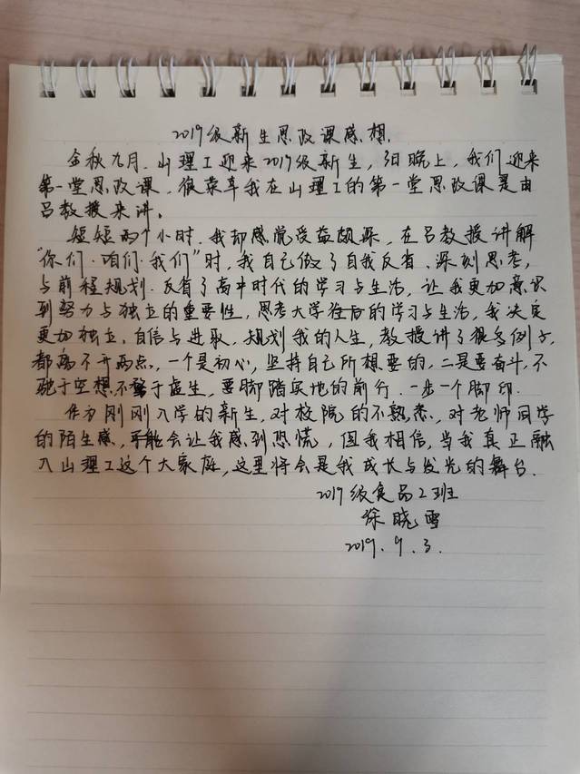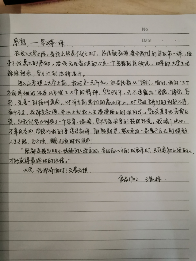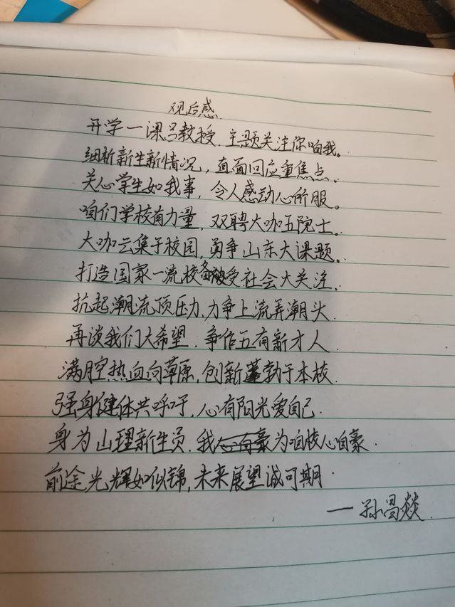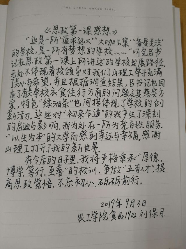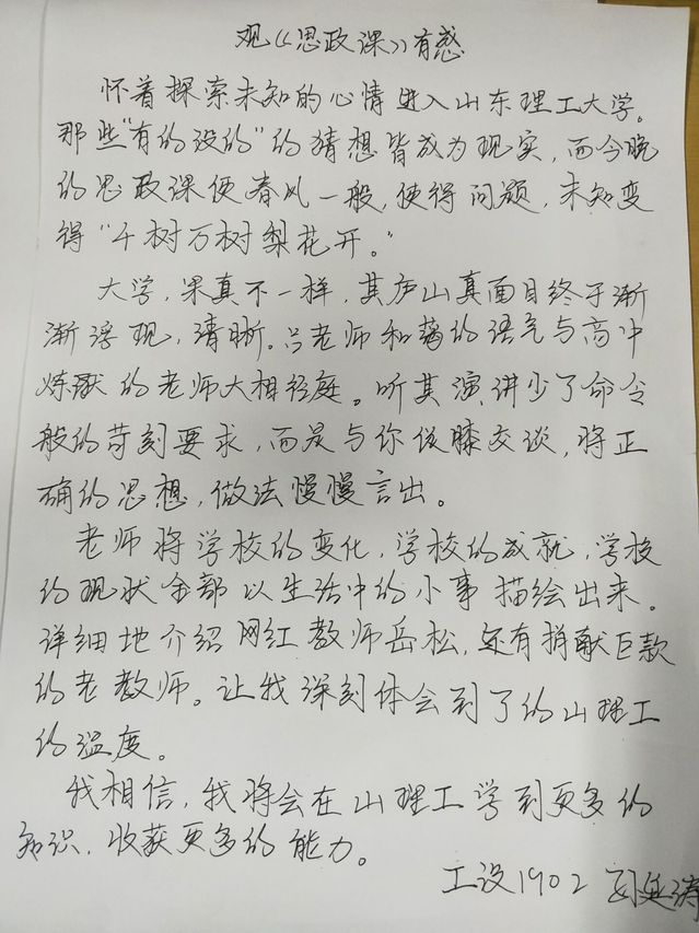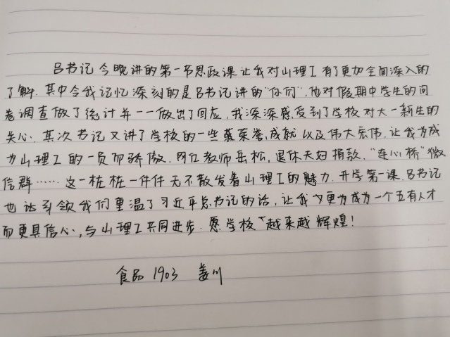 “这是一所“追求远大”“大咖云集”“备受关注”的公司,是一所有梦想的公司…”听完吕书记在思政第一课上所讲述的公司发展路径,无处不体现着校领导对我们山理工学子充满了关心与希望,并且根据调查结果,吕书记也回应了有关公司衣食住行方面的问题及其落实方案,特色“绿油条”也间接体现了公司的创新活力。这些对初来乍道的我产生了深刻的启迪与影响,我为处在一所为老百姓服务、“以生为本”的大学而感到幸运与幸福。感谢山理工打开了我的新世界。