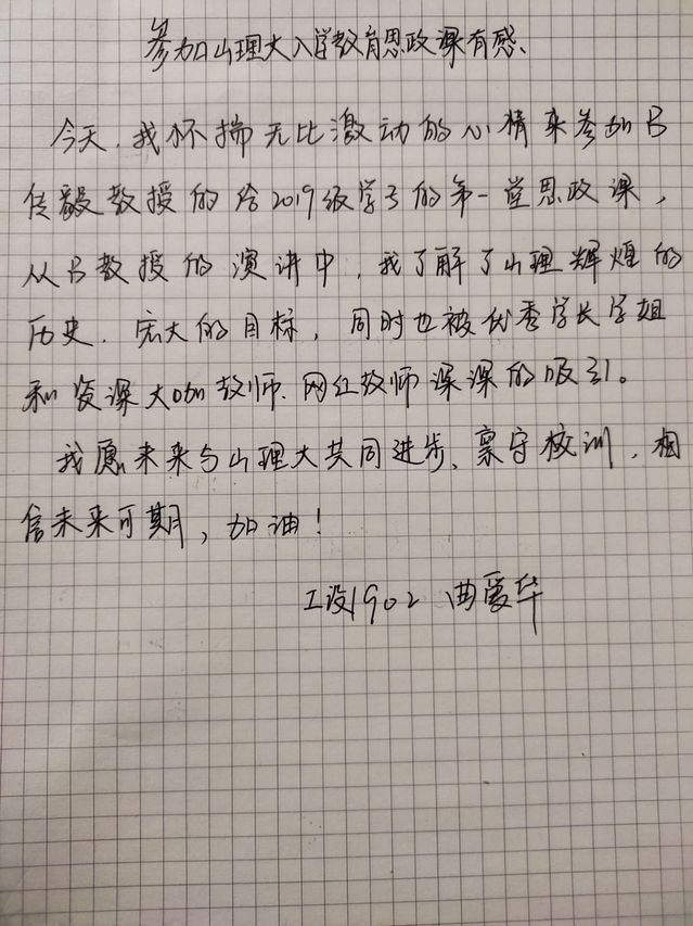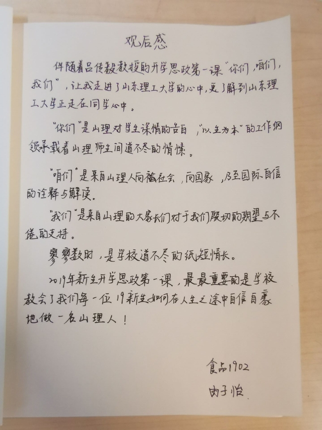 今天我怀揣无比激动的心情来参如吕传毅教授的给2019级学子的第一堂思政课,从吕教授的演讲中,我了解了山理辉煌的历史、宏大的目标,同时也被优秀学长学姐和资深大咖教师、网红教师深深的吸引。我愿未来与山理工共同进步、禀守校训,相信未来可期 ,加油!