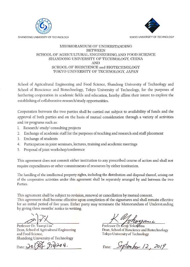 2019年9月20日,公司与东京工科老员工物科学与生物技术公司签订框架合作协议。