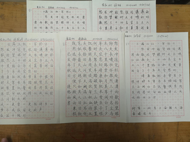 比赛伊始,学习部负责人讲解此次比赛的规则,以《满江红•写怀》这首诗词为基础,简述宋朝年间,爱国诗人岳飞出战征讨敌人所做的诗,全诗中,表达作者壮志难酬、为国杀敌的爱国情怀。负责人要求同学们在分发的田字格内,填好自己所在的公司、班级和姓名后,用中性笔照着《满江红•写怀》临摹诗词,最后,负责人将统一收齐,并对作品进行打分,公司前五名将可继续代表公司进行全校的比赛。