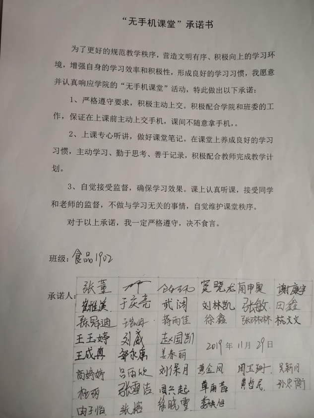 在活动前期,各班级开展“无手机课堂”主题班会,采用PPT讲解、集体讨论、宣读倡议书、签订承诺书等形式让同学们深入了解“无手机课堂”活动的内容及重要性;学习部也通过张贴海报、悬挂文明标语的方式,提醒同学们主动上交手机,自觉地遵守“无手机课堂”的各项规定。