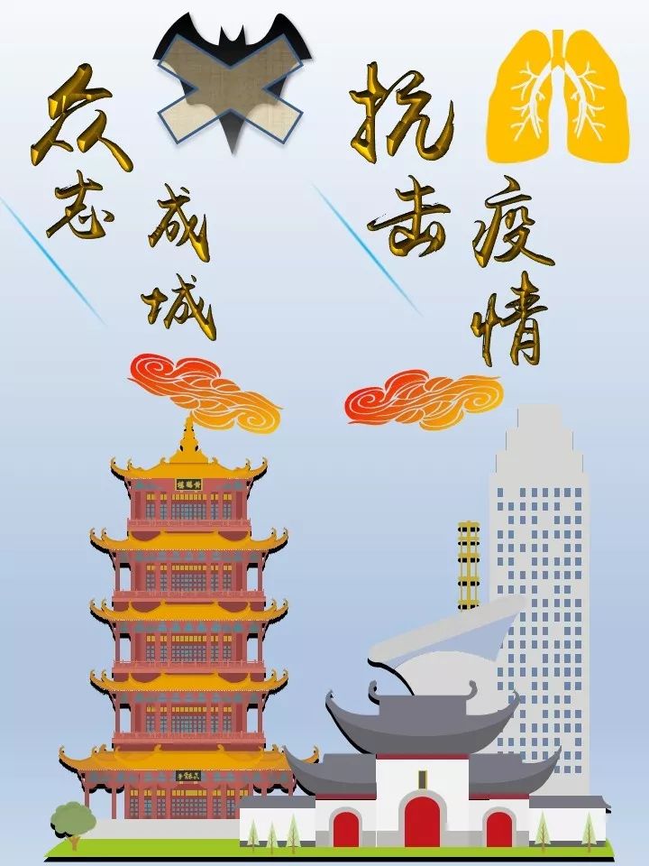 整幅海报从整体上揭示了此次的主题,包括了黄鹤楼、器官肺、蝙蝠、叉号、“众志成城,抗击疫情”字样、祥云等元素。首先,下半部分以黄鹤楼等建筑代表武汉;然后右上角肺的器官代表此次的新型冠状病毒,另外上方的蝙蝠代表这次疫情的来源,叉号表示要严禁野味;最后“众志成城,抗击疫情”几个大字呼吁我们要联起手来,一起抗击疫情,最后的两朵祥云预示着我们一定可以战胜疫情。海报以渐变的蓝色为背景作为蓝天,寓意抗击疫情的决心和必胜的信心。