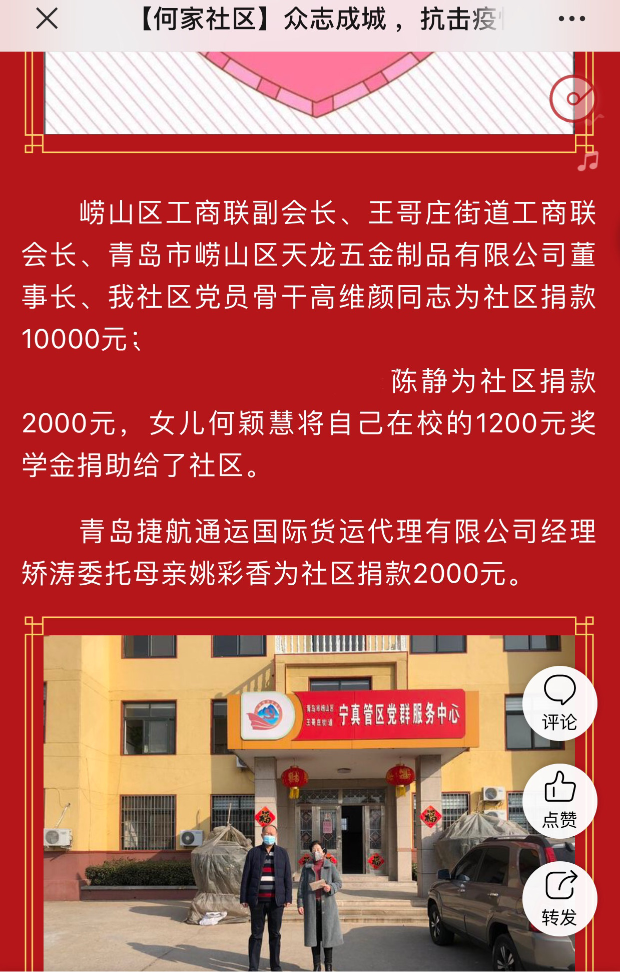 食品1804班的何颖慧家庭,为社区无偿捐款3200元,值得一提的是,其中1200元是何颖慧在校表现优异所取得的奖学金。