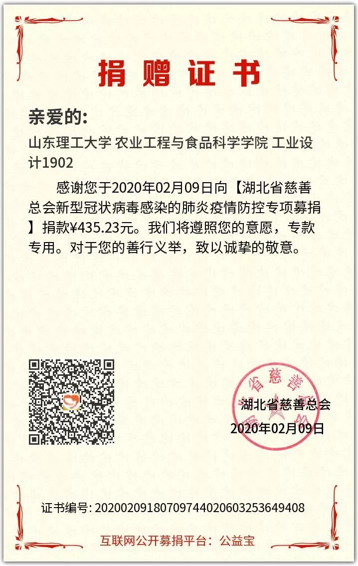 工设1902班,在班级范围发起了“武汉加油、我为武汉献爱心”捐款活动,募集了435.23元善款,以“谈球吧官方网站工业设计1902”的名义于2月9日捐赠湖北省慈善总会。