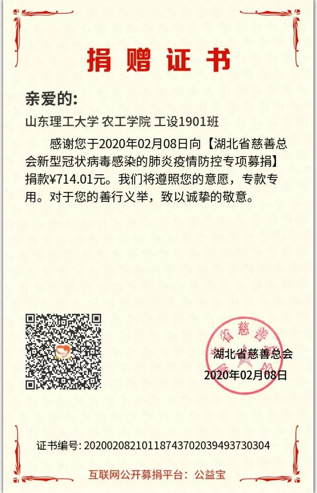 工设1901班组织了“天佑中华,力援武汉”募捐活动,筹集共计714.01元善款,并以“谈球吧谈球吧官方网站工设1901班”的名义全部捐赠给湖北省慈善总会。
