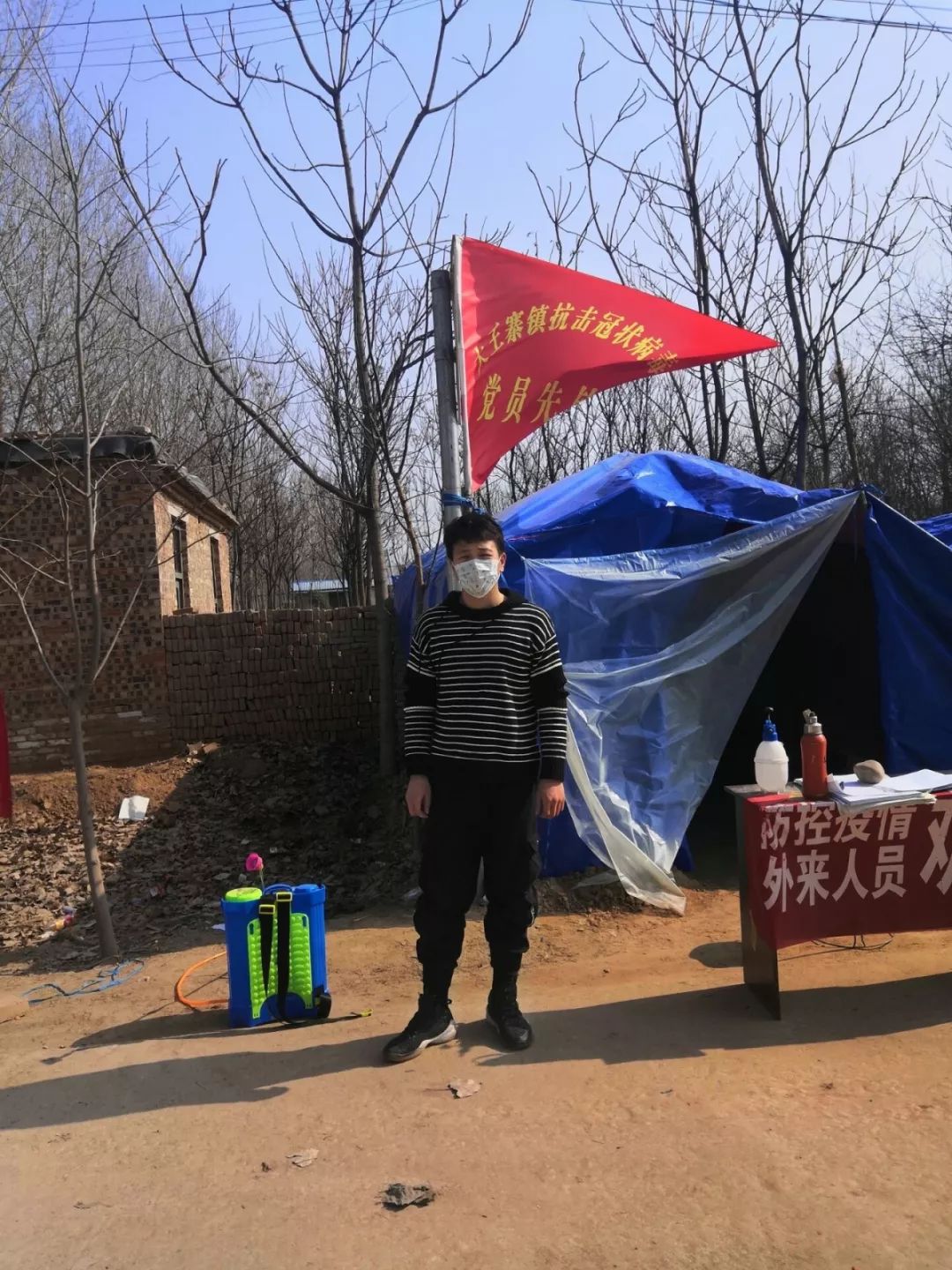 张冠帅,农机1805班班长。山东省启动重大突发公共卫生事件Ⅰ级响应后,张冠帅同村里的老党员一道,在村口劝返点值勤,对进出村人员进行体温测量与登记劝返。