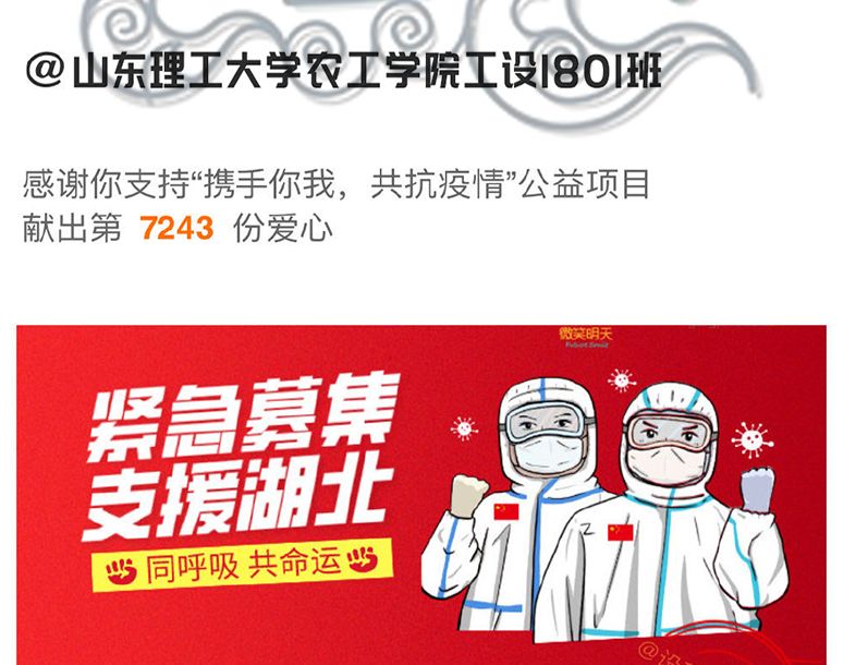 工设1801班的同学们共同筹集了800元,全部赠给“携手你我,共抗疫情”公益项目。