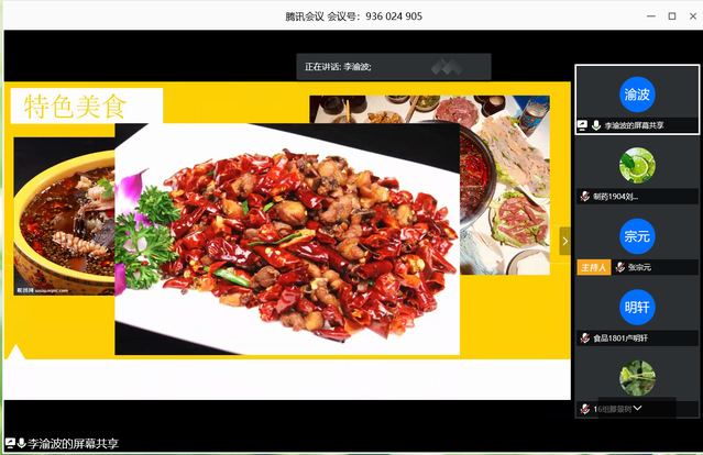 此次活动以小组制的方式进行,每个小组一至三位同学,参赛小组搜集整理当地的饮食风俗,以PPT的形式向同学们演讲展示。社团骨干人员拟定评分细则,排出名次,公示结果。活动报名阶段,同学们踊跃参加,在活动群里热烈地寻找着自己家乡的小伙伴,一旦组建好队伍,同学们就一起商量、积极地准备PPT,由于此次活动是在腾讯会议上开展,同学们为确保自己的演讲效果,都会提前准备好PPT,在腾讯会议上演示。活动期间,每一支队伍的主讲人借助PPT分享自己的家乡,分享其饮食风俗、特色美食以及饮食文化。在此次活动中,展示的著名美食有福建的佛跳墙、湖南的长沙臭豆腐、宁夏的奶豆腐、山东的德州扒鸡、广西的特色米粉、云南的汽锅鸡、新疆的馕、黑龙江的榛蘑炖鸡、河南的胡辣汤等等全国各地的特色美食。
