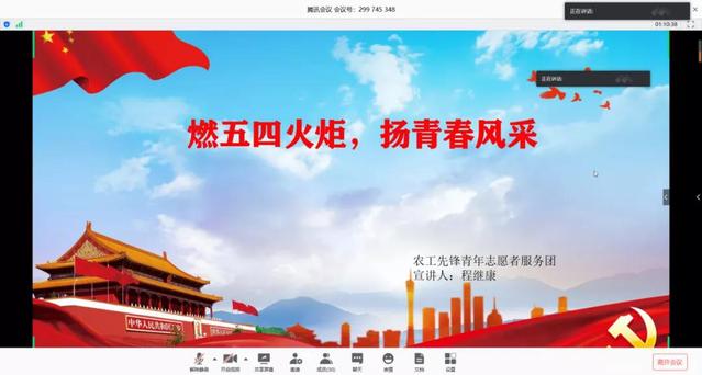 为培养志愿团成员精神素养,牢记五四运动精神,农工先锋青年志愿者服务团于5月4日上午举行“燃五四火炬,扬青春风采”主题活动。此次活动以视频会议方式线上进行,外联部干事程继康主持,志愿团全体成员参与。