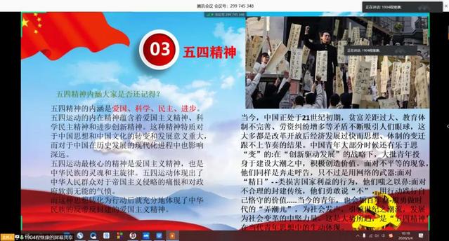 活动伊始,程继康简单介绍活动流程并带领志愿团全体成员进行集体宣誓。随后,程继康讲述五四运动背景,与志愿团成员一起观看《我的1919》等电影片段,回顾五四运动的历史过程,学习五四运动精神的内涵。然后,同学们共同学习优秀青年需遵守的四项原则,抗击新型冠状病毒战役中涌现的优秀青年典型事迹。最后,程继康讲述理论实践结合重要性,鼓励志愿团成员向优秀青年学习,积极参加志愿服务。