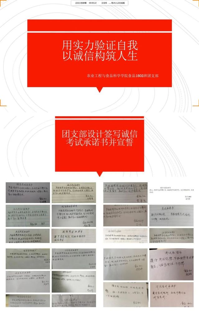 本次“用实力验证自我,以诚信构筑人生”主题团日活动活动顺利进行,各团支部应用各种形式带领同学们积极响应诚信考试的要求,尽快投入到期末考试复习状态,用诚信的执念抒写满意答卷。