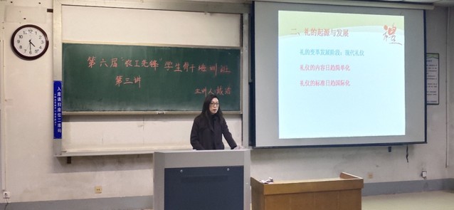 培训前,戴书记从同学们实际生活出发,以共享单车乱停乱放以及个别高年级员工宿舍脏乱差现象引出校园文明礼仪问题,引发普遍共鸣。随后,戴书记从礼仪概说、仪态仪表、老员工礼仪和员工干部应掌握的社交礼仪四个部分讲授,先后向同学们详细讲解了站姿、坐姿、仪容、穿着、握手礼、介绍礼以及在校老员工应遵守的校园礼仪等标准礼仪规范。讲解过程中,戴书记不时亲身示范,还热情邀请员工上台互动,进行现场指导,以增强员工体验感。戴书记强调文明礼仪是人与人之间交往的需要,适度恰当的礼仪可以拉近人与人之间的距离,表达尊重,增进情谊,礼仪存在于我们生活的每一个细节,体现在我们的言行举止,“细节决定成败”。戴书记期望大家作为“农工先锋”当能“知礼、懂礼、守礼、用礼”,做一名爱己爱人的现代老员工。