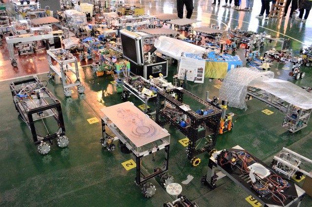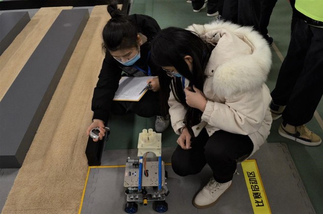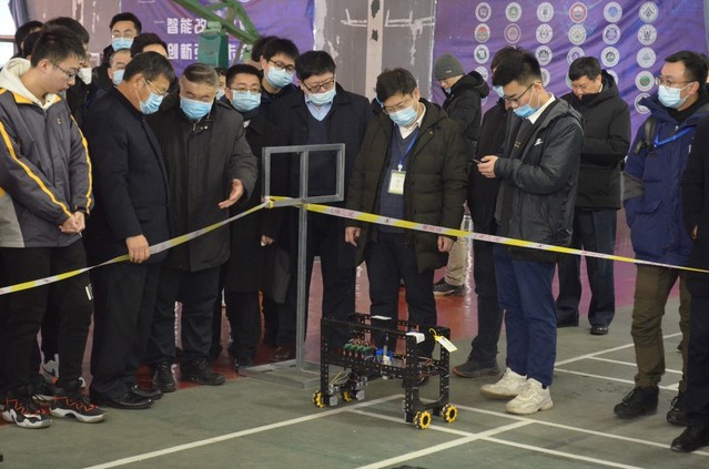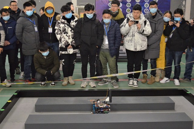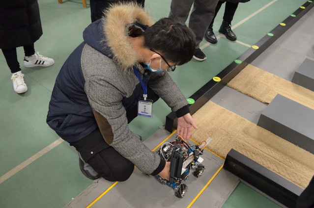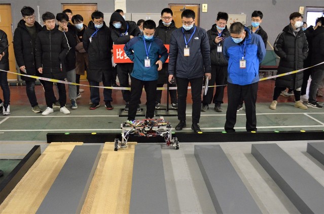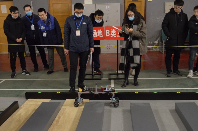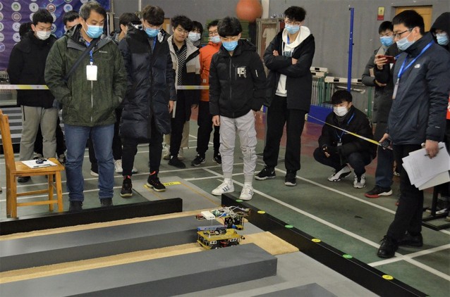 此次比赛共分四个场地,比赛人员随机分配。每支参赛队伍在比赛开始前调试好机器并封存于指定位置。比赛开始后,志愿者引导参赛队伍有序入场参赛,每支参赛队伍有两次机会,每次开始前有一分钟准备时间。评委们细致负责,认真按规定评分。陈学庚院士一行人亲临现场观看、指导比赛。比赛过后,参赛队伍从场地出口有序离场。