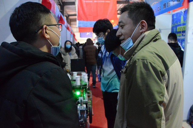 各参赛团队先于装备展示区进行设备调试,专家评委到达后,按序听取各团队代表答辩。答辩人从产品设计背景、结构、操纵方法、实际应用、创新点等方面进行汇报,随后,评委对作品进行问审。