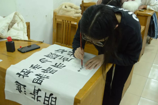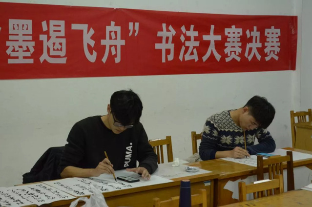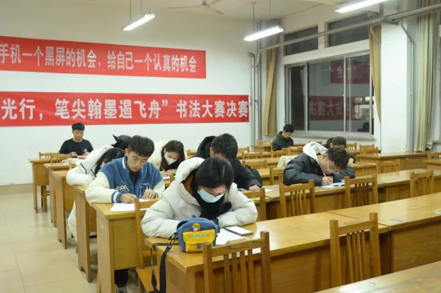 在软笔作品创作现场,挥毫笔墨宣纸间、笔尖舞动跳跃。比赛期间同学们端坐桌前,认真书写,落笔盖章浑然一体,充分显示书写者的书法基础;硬笔书法比赛过程中,同学们行笔流畅,字体端稳,虽无大开大合之势,亦有跃然纸间之美。