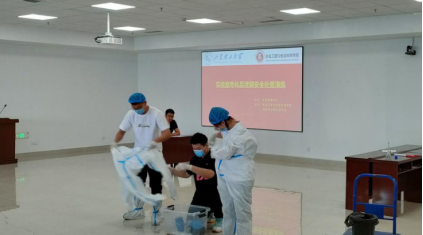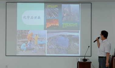 随后,能源系实验室主任李永军作了题为《实验室化学品泄漏安全处置》的主题讲座,讲座从应急组织机构、汇报程序、实验室使用的主要危险化学品、应急处理宗旨、泄漏物的控制、PPE(个人防护用品)的选择、废液的收集等七个方面进行详尽的讲解。演练配合讲解,使与会师生对化学品泄漏处理流程和规范的认识更加深入。