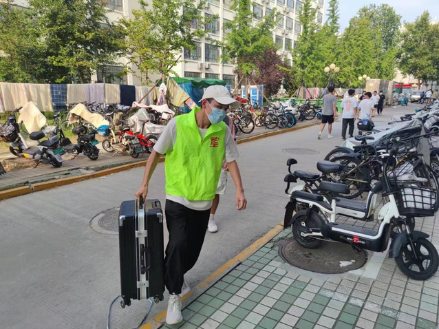 宿舍楼内,暖心服务。返校员工入校后第一时间完成核酸检测,入住员工公寓。辅导员和志愿者帮助返校同学搬运行李,当起了“运输工”,提运的不仅仅是沉甸甸的行李,更是传递的暖洋洋的爱。