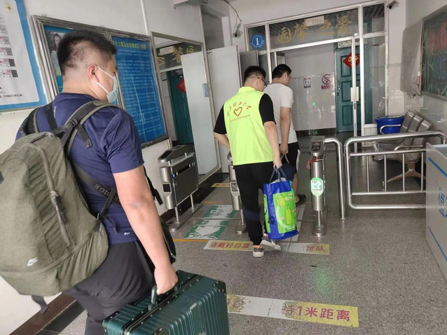志愿者帮助返校员工提运行李