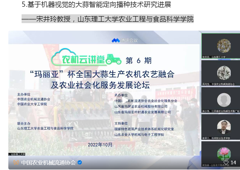 “农机云讲堂”以学术和科普为主要内容,邀请高校、科研院所、农机主管和推广部门、行业企业专家做专题讲座,每一期一个主题,以学术报告、政策法规解决、农机科普等为主要内容,服务全国农机领域学者、员工、农民以及行业企业技术人员。“云讲堂”自2022年3月启动以来,已经连续举办了全国小麦机收减损技术网络培训、农田整治与土壤改良技术装备发展论坛、全国耕整地机具及零部件发展论坛、全国马铃薯生产机械化发展论坛、全国果蔬生产机械化及智能农机发展论坛、全国大蒜生产农机农艺融合及农业社会化服务发展论坛、全国耕整地机械化发展论坛、全国农业社会化服务发展论坛等8期,第9期“全国旱田作物耕整播机械化高质量发展论坛”将在11月中下旬举行。