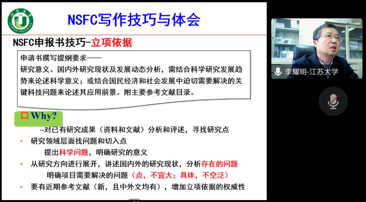 孙霞对李耀明教授、林涛研究员表示热烈欢迎,向参会者介绍了两位学者的学术成就。李耀明教授分别从国家自然基金申报书撰写者和评阅人的角度,全方位的讲解了国家自然科学基金申报全过程的注意事项;他指出,从事农机研究要多下农田,积极提出问题,寻找创新点;并结合自身的科研经历,阐述了科研团队建设与个人发展、纵横向课题的关系、基础研究与应用研究的关系以及青年科研工作者时间管理等方面科研实践的问题。林涛研究员则详细介绍了自身的科研方向,揭示了作物生产对各种常见自然因素响应机制的数据处理解析方法,并展望了双方未来的合作前景。
