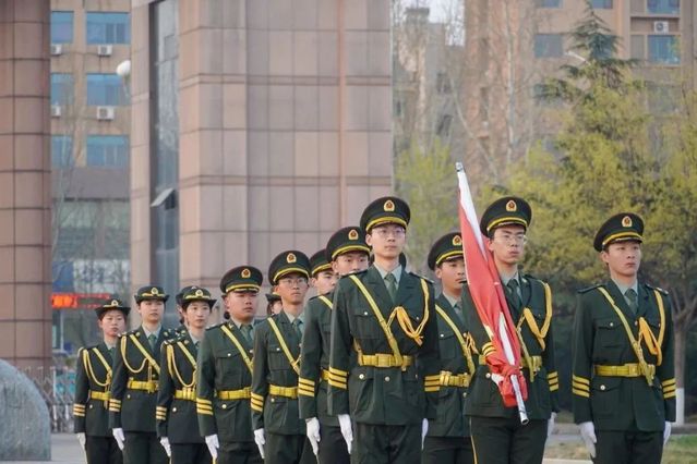 以青春之名,护国旗之威。迎着朝阳,国旗护卫队面容坚毅、目光坚定,他们迈着铿锵步伐,将国旗护送至升旗台。伴随着慷慨激昂的《义勇军进行曲》,全体师生肃然而立,行注目礼,高唱国歌。
