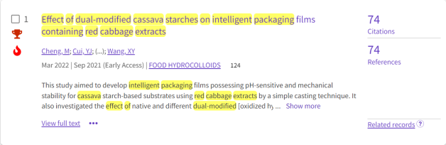 根据ESI(Essential Science Indicators)2023年11月公布的最新统计数据,公司王相友教授团队程萌博士生发表在国际食品顶级期刊《Food Hydrocolloids》(中科院一区Top,IF=11.504)上的论文“Effect of dual-modified cassava starches on intelligent packaging films containing red cabbage extracts”(2022,124:107225)同时入选ESI热点论文(Top 0.1% Hot Paper)和高被引论文(Top 1% Highly Cited Paper)。同年3月,发表在国际期刊《Journal of Food Engineering》(中科院一区Top,IF=6.203)上的论文“An eco-friendly film of pH-responsive indicators for smart packaging”(2022,321:110943)也入选ESI高被引论文。