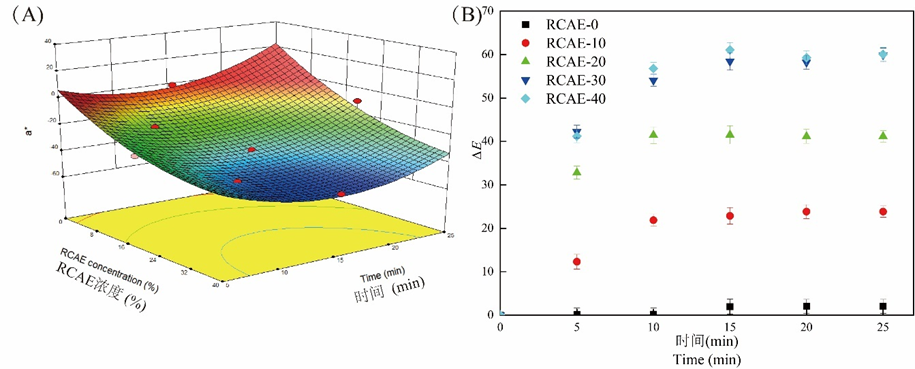 图4 (A) a*值随RCAE浓度和熏蒸时间变化函数的响应面图,(B) ΔE*变化趋势