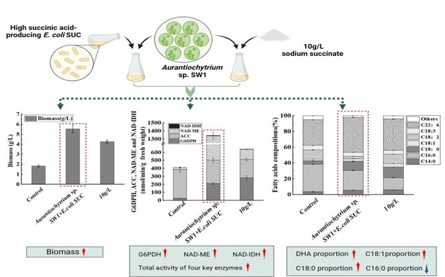 研究结果表明,一株高产琥珀酸的细菌与微藻共生关系表现为一种动态而相互有益机制。细菌通过增加藻类脂质积累途径中关键酶活性,同时在共生环境中缓慢持续释放琥珀酸的双重调控机制,有效地促进了微藻Aurantiochytrium sp. SW1的生物量和脂质积累。通过最终的发酵过程优化,Auntiochytrium sp. SW1的生物量增加了3.17倍,总脂质含量增加了2.63倍。该工作有助于揭示微藻与细菌之间动态相互作用的复杂性研究,为藻菌共生关系对藻类的脂质合成及多不饱和脂肪酸(DHA)生产提供了基础。