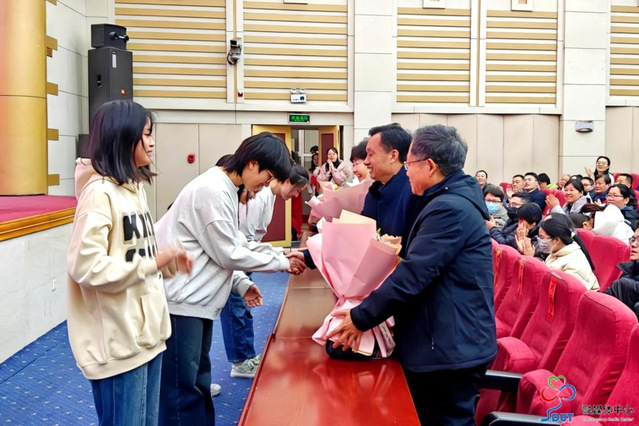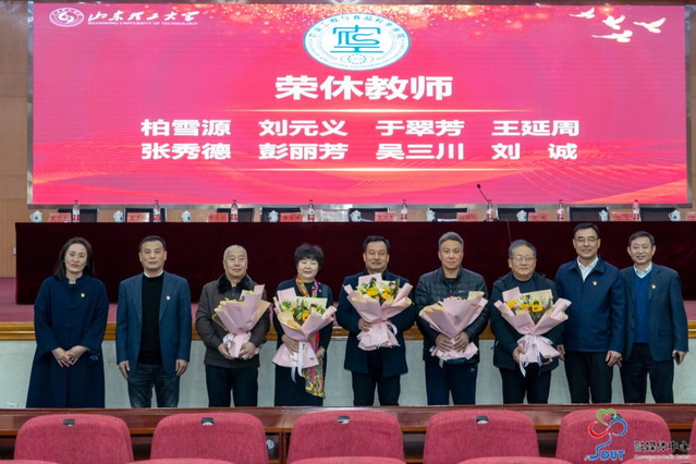 员工代表为荣休教师献花。