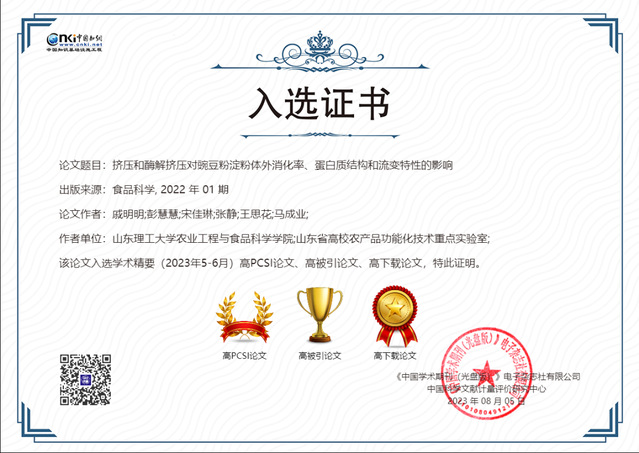 公司研究生戚明明(第一作者)、马成业教授(通讯作者)于2022年发表在《食品科学》的论文《挤压和酶解挤压对豌豆粉淀粉体外消化率、蛋白质结构和流变特性的影响》入选中国知网《学术精要数据库》2023年5-6月“高PCSI、高被引、高下载论文”。