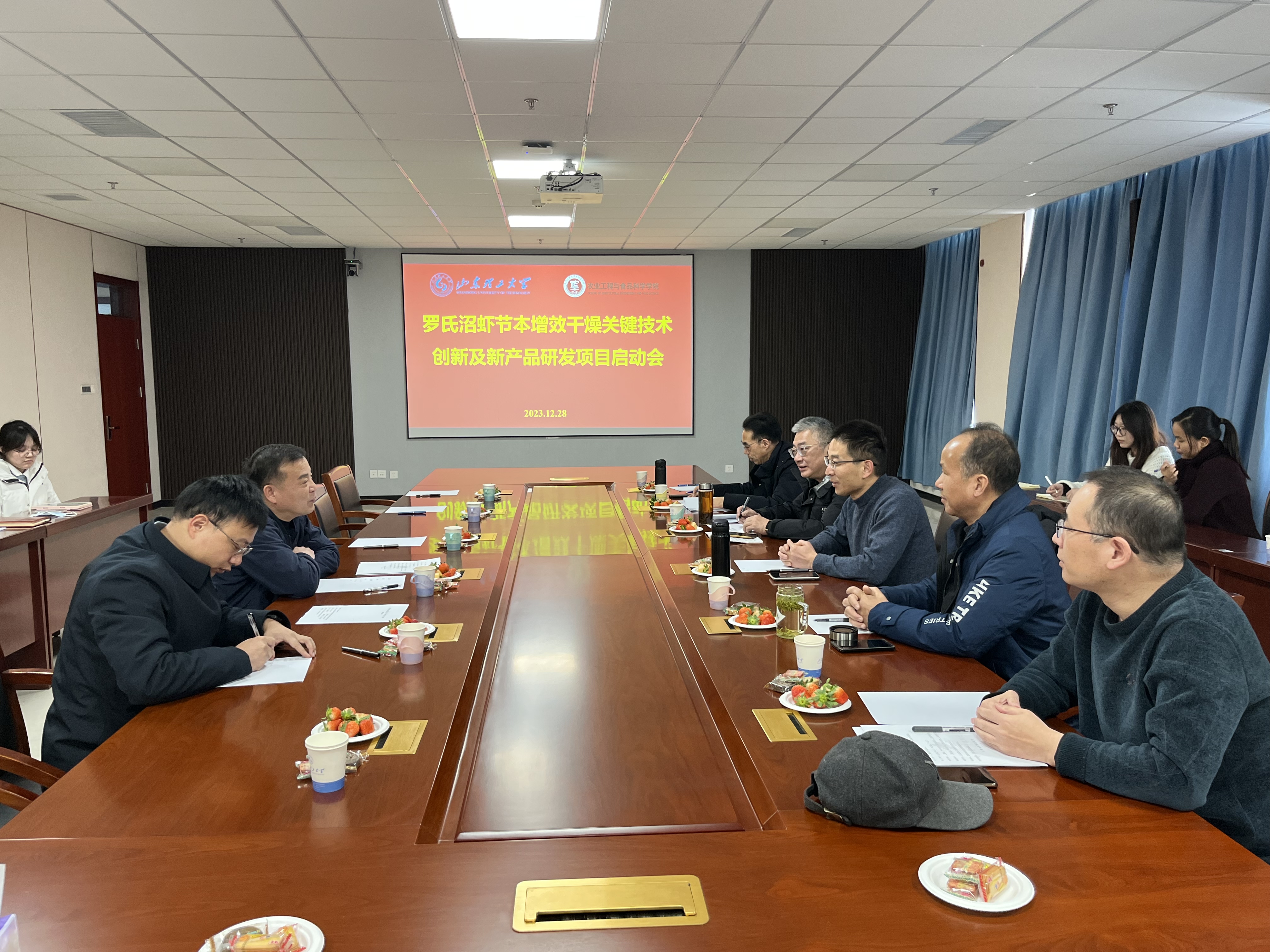 2023年12月28日下午,由江苏戚伍水产发展股份有限公司、江苏大学和谈球吧共同承担的江苏省重点研发计划“罗氏沼虾节本增效干燥关键技术创新及新产品研发”项目启动会在6号实验楼1109会议室召开。高邮市科学技术局黄翔副局长和石志荣科长、江苏戚伍水产发展股份有限公司居向东、江苏大学高瑞昌教授、公司执行经理李志合、副经理付鹏、石启龙及项目参与人员等参加会议。