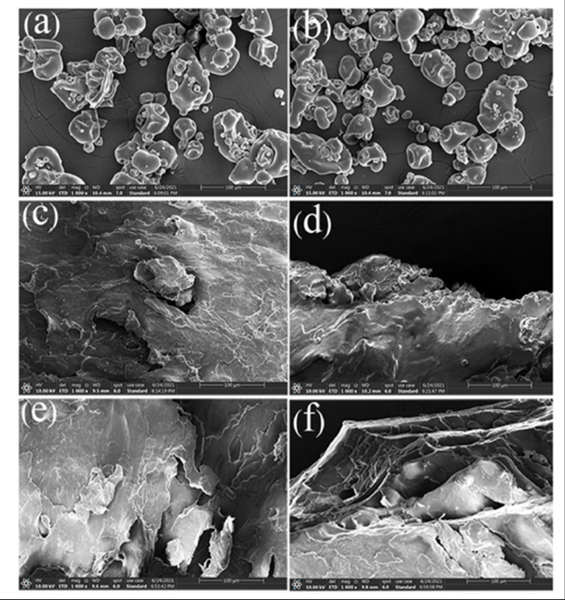 (a,b)豌豆蛋白,(c,d)豌豆蛋白挤出物,(e,f)含有L-半胱氨酸的豌豆蛋白挤出物