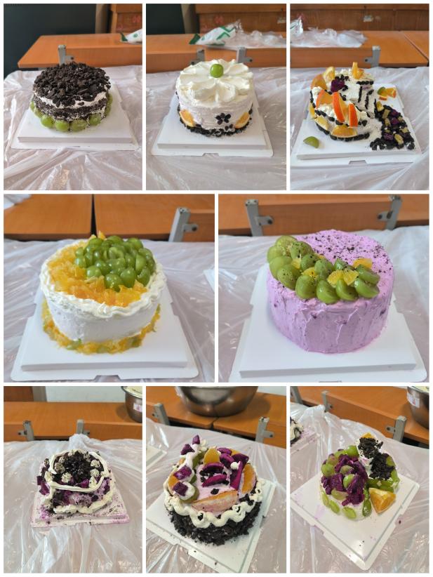 不到一小时,一个个精致、绚丽的蛋糕呈现在众人面前,体现了选手们各具特色的构思和愿望,令人眼花缭乱,垂涎欲滴。最终,通过大众评审及第三餐厅的裱花师傅的线上评分,根据各小组的创意设计度、制作美观度和整洁度评选出一二三等奖。