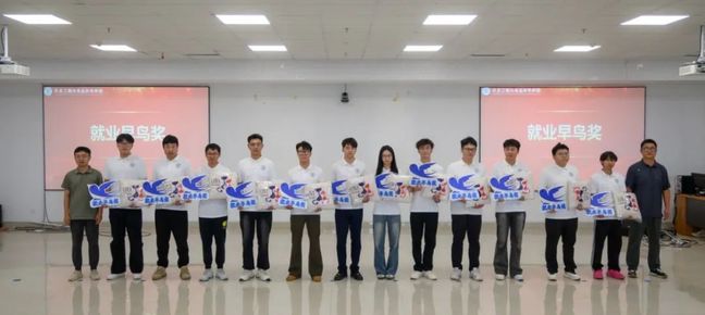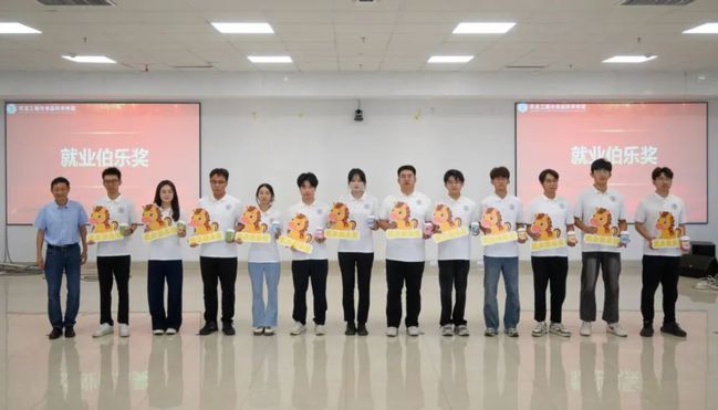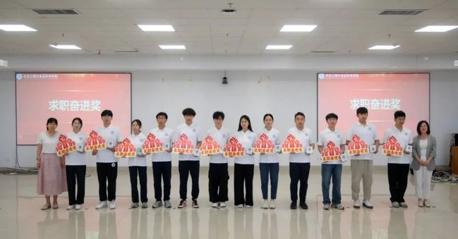 公司领导、教师代表依次为“就业早鸟奖”“求职奋进奖”“升学锦鲤奖”“基层奉献奖”“就业伯乐奖”获奖员工代表颁奖。